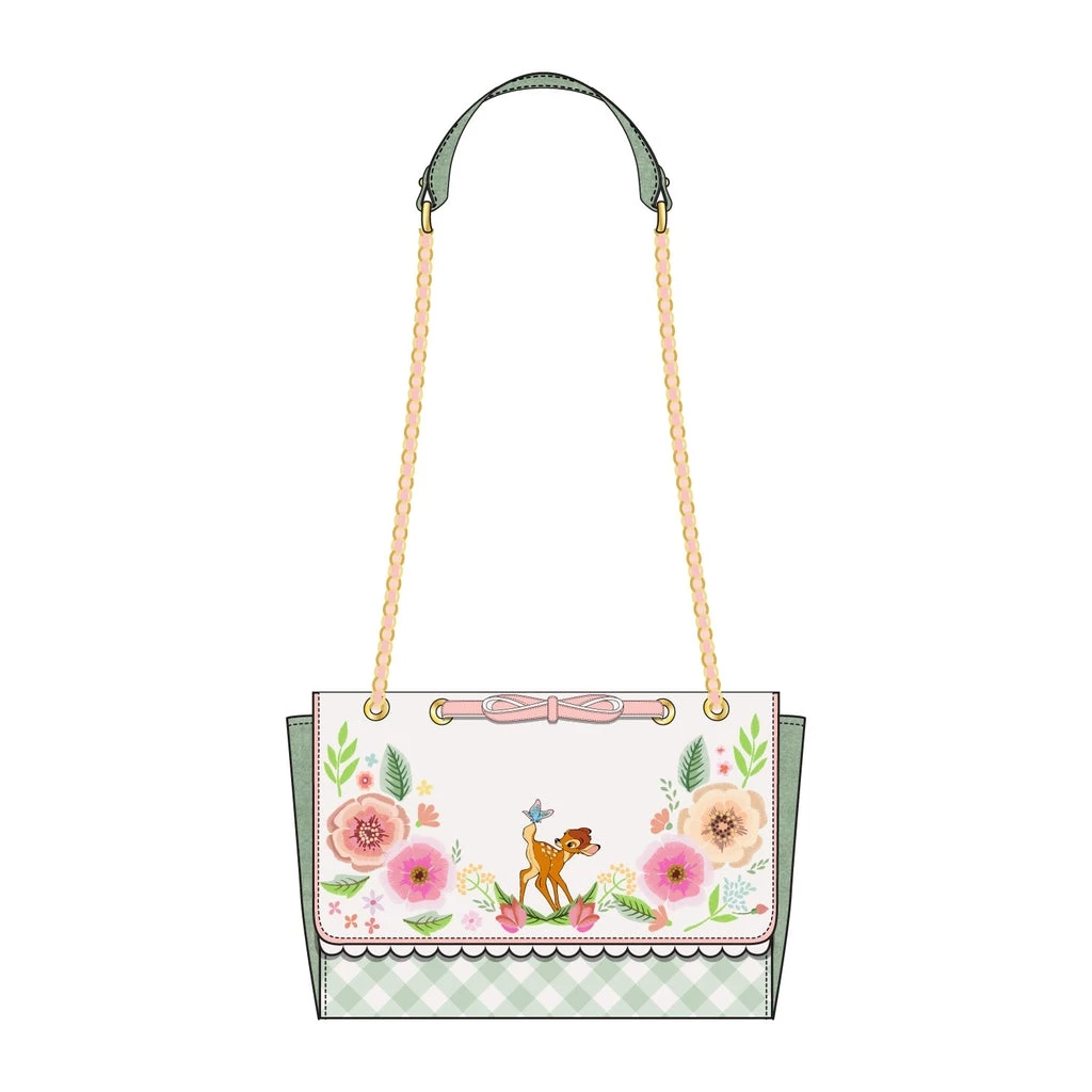 The Loungefly Bambi Spring Time Crossbody Bag is made of vegan leather (polyurethane) with faux suede trim. Bag has a chain shoulder strap, sturdy metal hardware, and features: faux leather decorative bow, embroidered, and printed details. Take note of the coordinating pattern of the inside lining fabric.