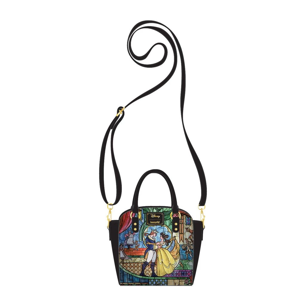 Celebrate the 30th Anniversary of Disney’s Beauty and the Beast with the Loungefly Disney Beauty and the Beast Belle Castle Crossbody Bag! It’s designed to look like stained glass windows and features vibrant colors and intricate detail. The front shows Beast’s castle with Belle reading at the fountain. The opposite side of the bag shows Beast transformed back into his princely visage, dancing with Belle in her yellow gown. Any royal subject would love to have such a beautiful accessory to their regal wardrobe.