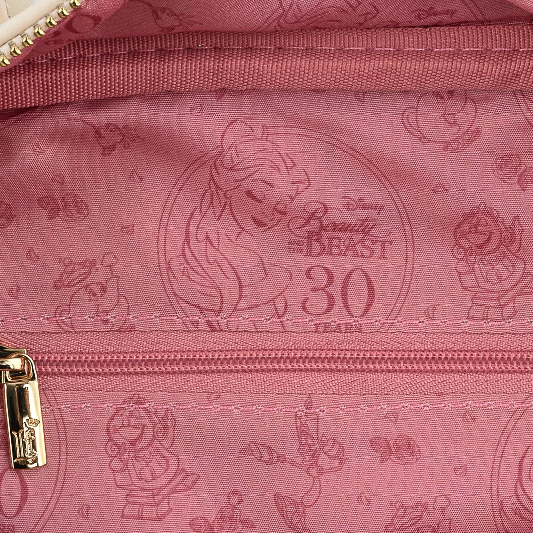 Show off yourย Disneyย fandom with this Beauty and the Beast Rose Crossbody Purse! It is made of pearlescent faux leather and features a top snap closure, adjustable strap, matching themed lining, faux leather studded applique closure, applique, metallic debossed, and enamel zipper puller charm details. This crossbody purse approximately measures 10 1/2-inches wide x 8 1/2-inches tall x 4-inches deep. Ages 15 and up.