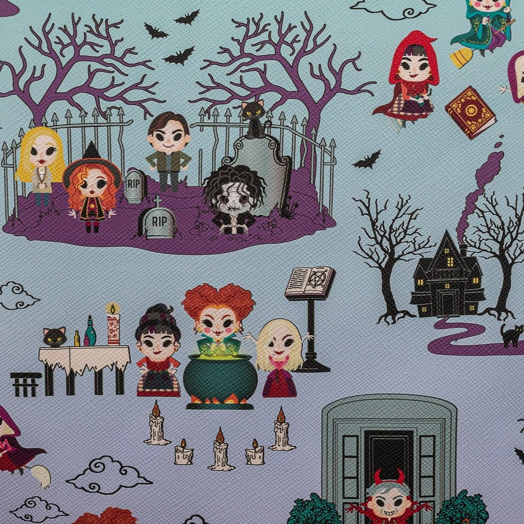 The Sanderson sisters are on the move. Help them on their mission for immortality with the Disney Hocus Pocus Scene Mini Backpack. Scattered among the print there’s Winifred, Mary, and Sarah are brewing up something wicked, the black cat Thackery Binx with Max and Dani Dennison, trick-or-treaters, and graveyard scenes just to call out a few. This bag is great for a Halloween-themed outfit or for everyday use as you carry out your plans.
