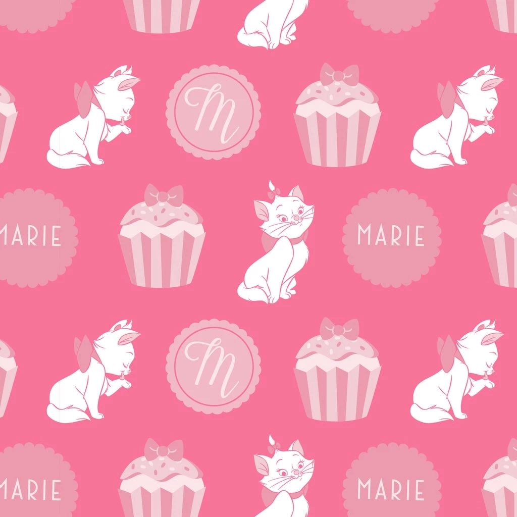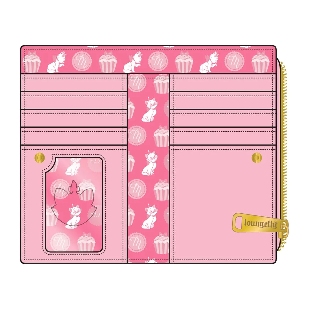 The front flap is a white frosting, sprinkle cupcake, with Marieโs ears and pink bow sticking out. The back flap features alternating dark pink and light pink stripes. Note the coordinating inside lining, which carries a Marie and cupcake motif pattern. In addition to printed details, this bifold wallet features embroidered, debossed, applique, and lace details; gold snaps and zippers to keep everything in place, and vegan leather (polyurethane).
