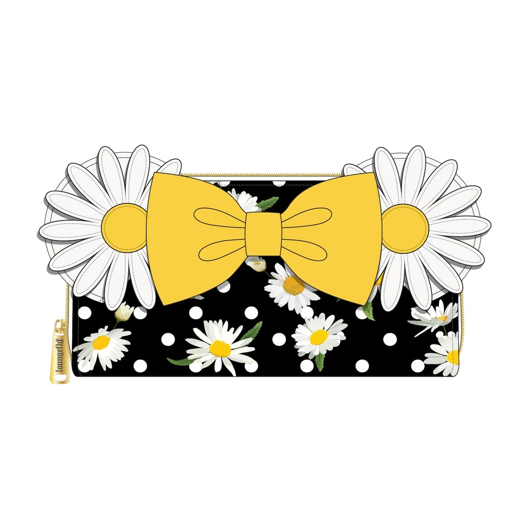 Get ready for spring with the Minnie Mouse Daisy Zip Around Wallet! The white daisies and polka dots stand out against the black background, adding a bright yellow zest to spring or even summer outfits. The wallet has 6 slots for holding cards, a clear window slot for holding your ID, and a zipper pocket. This wallet will help you brighten the new year!