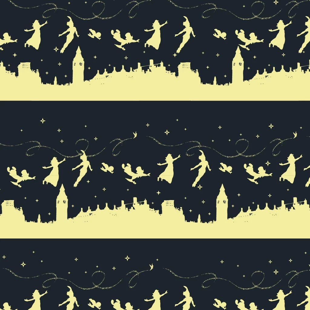 On the front of the wallet, Peter Pan, Wendy, Michael, and John fly near Big Ben. Not only does the face of the clock glow in the dark, but the windows in the clock glow as well. On the back of the wallet, a wondrous, star-lit night awaits happy thoughts of flying. Note the coordinating inside lining. The wallet, with gold-colored zipper hardware, features vegan leather (polyurethane) and printed, embroidered, and glow-in-the-dark details.