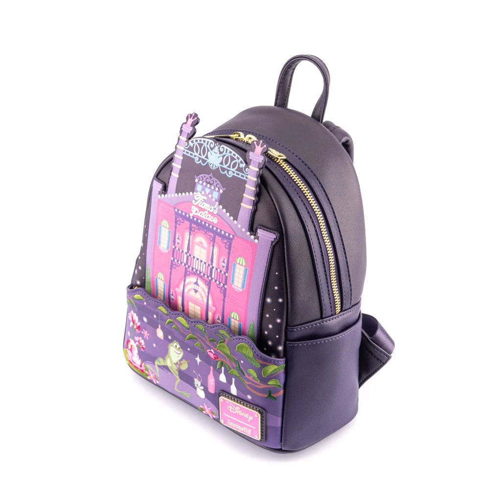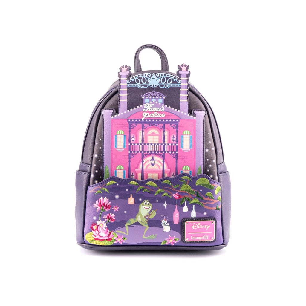 Don’t forget to celebrate your hard work! You’ve been “almost there” for a while and now’s the time to treat yourself with the Loungefly Disney Princess & the Frog Tiana’s Palace Mini Backpack. Tiana’s Palace is lights up the bayou background both with bright colors and the light pouring out of the windows. On the back you can see Princess Tiana and Prince Naveen walking among the tables. Any Princess Tiana fan would love this beautiful backpack.
