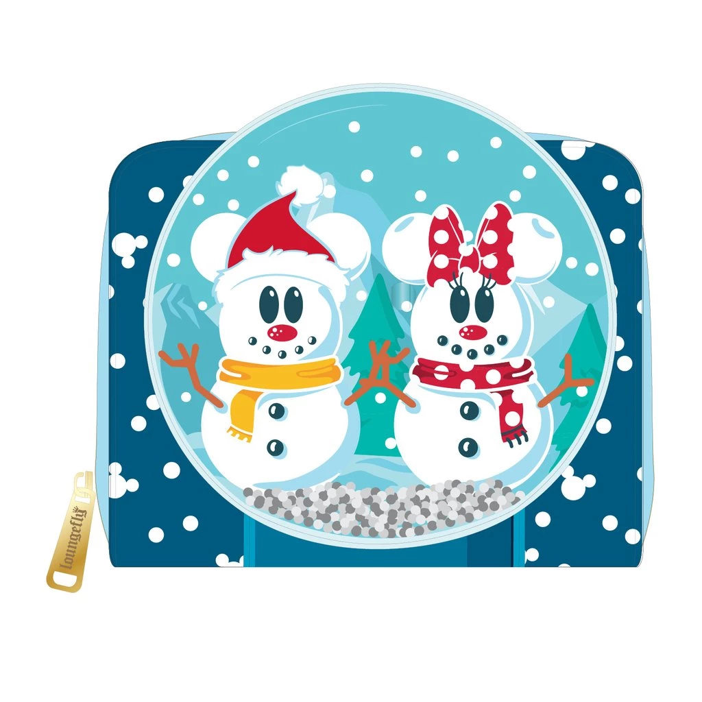 Let it snow, let it snow, let it snow with the Loungefly Disney Snowman Mickey and Minnie Mouse Snow Globe Zip Around Wallet. This cool design features Mickey and Minnie Mouse as snow sculptures and a snow globe effect with tiny pom poms. The perfect accessory for your winter wardrobe is here.