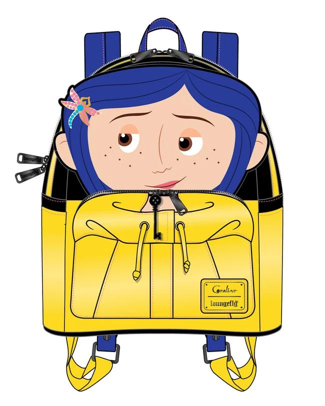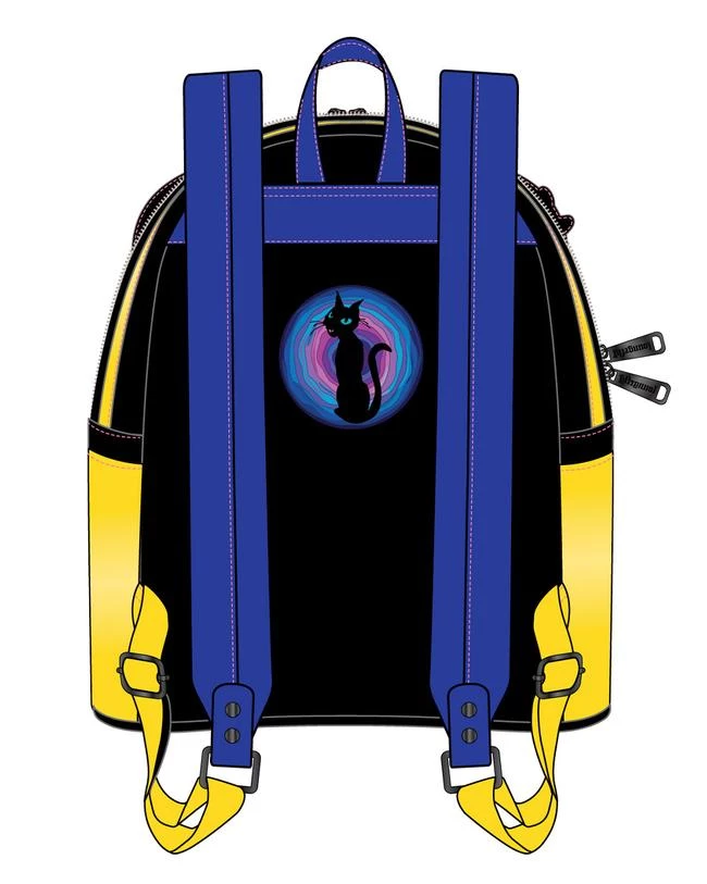 It is made of faux leather and features a top zipper closure and front zippered pocket, adjustable straps, matching themed lining, denim and faux leather applique, metal buckle, button, embroidered, debossed, and printed details. This mini-backpack approximately measures 9-inches wide x 10 1/2-inches tall x 4 1/2-inches deep. Ages 15 and up.