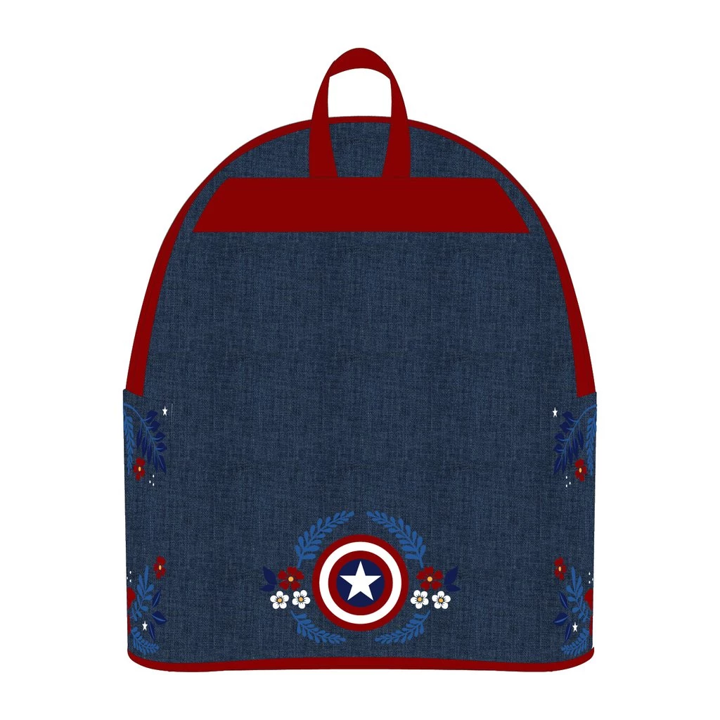Celebrate the 80th Anniversary of super-soldier, Captain America, with Loungeflyโs Marvel Captain America 80th Anniversary Floral Shield Mini Backpack. Red straps and red, white, and blue flowers beautifully accent this dark blue denim bag. The front pocket is made to look like Captain Americaโs classic vibranium shield and features chenille details. Fight for justice and celebrate one of your favorite Marvel heroes in style with the Captain America 80th Anniversary Floral Shield Mini Backpack.