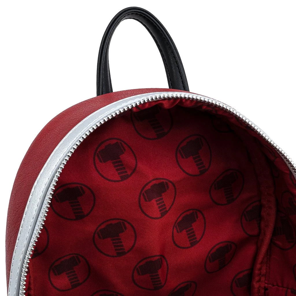 This faux leather mini backpack includes applique, embroidered and plaque details. The interior lining includes an all over print pattern of Thor’s mighty hammer. Look for the new crown rivets on the backpack straps. This will let you know that this is an official Loungefly product and not a knock-off! All new backpacks will have the crown strap rivets.Â