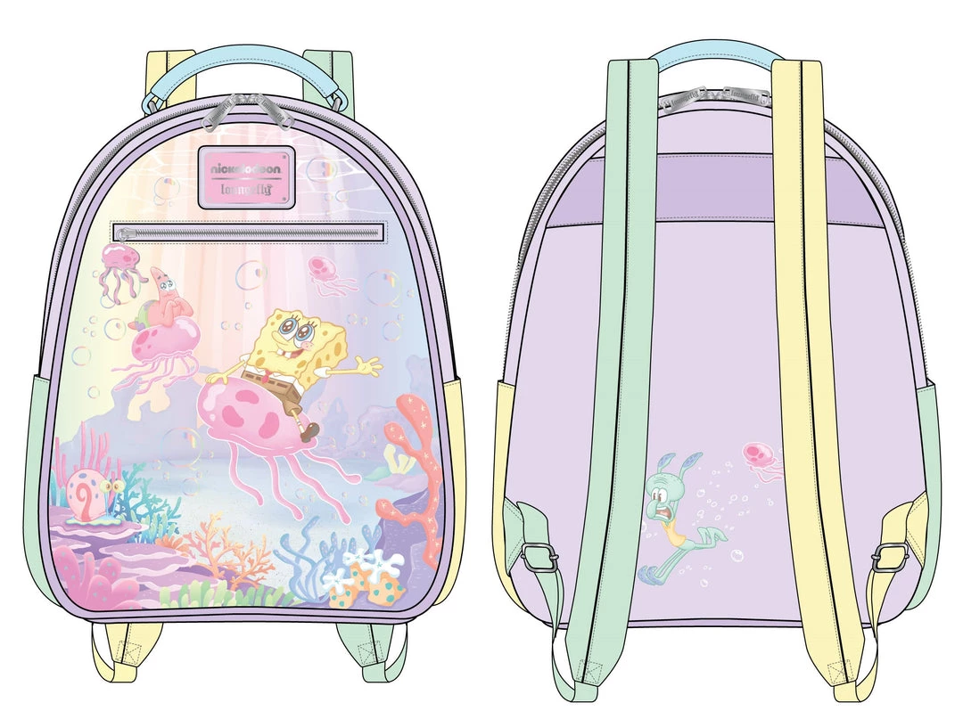 With a la-la-la-la-la, follow SpongeBob to Jellyfish Fields, where jellyfish buzz about, making their jellyfish jelly. Make room for the day’s catch in this SpongeBob SquarePants Jelly Fishing Mini Backpack. On the front, SpongeBob is riding a graceful jellyfish, accompanied by Patrick Star and Gary, in a pastel wonder of coral and iridescent printed bubbles. SpongeBob’s eyes are wide with happiness, as he is in his element. An enamel zipper charm of a jellyfish completes the look. On the back, Squidward runs from a jellyfish that’s about to sting him. Note the coordinating inside lining.